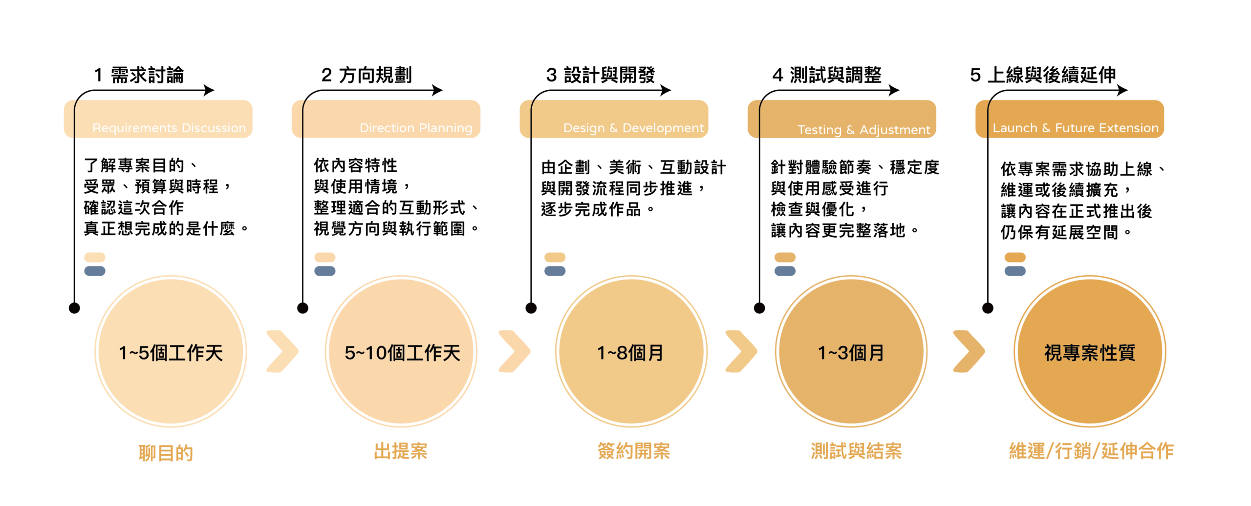 不同專案有不同的完成方式。我們提供從前期企劃、視覺設計到互動開發的整合服務,依照專案目標與內容特性,整理出適合它的表達形式。